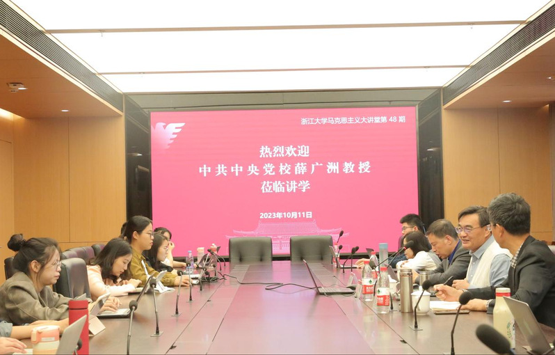 10月11日,浙江大学马克思主义大讲堂第48期顺利举行。本次大讲堂邀请中共中央党校、全国中国特色社会主义理论研究会执行会长薛广洲教授主讲《中国特色社会主义制度自信的哲学逻辑》。讲座由浙江大学马克思主义学院院长刘同舫教授主持,马克思主义学院成龙教授作为与谈人参会,学院师生30余人参加本次讲座。