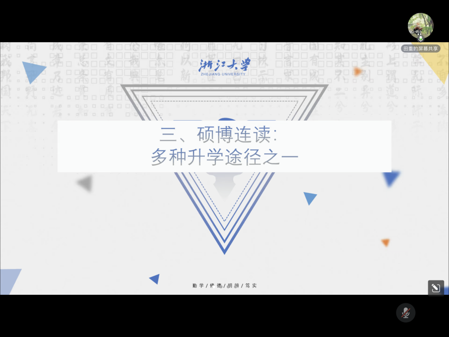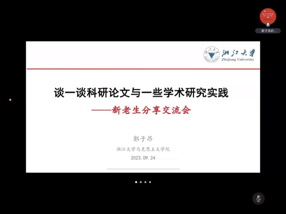 9月24日晚,2023级硕士新老生交流会在线上顺利开展。硕士生王耀庭、郭子昂,硕博连读生田重分享了自己在学习、生活、学生工作等方面积累的经验,全体2023级研究生新生参加。