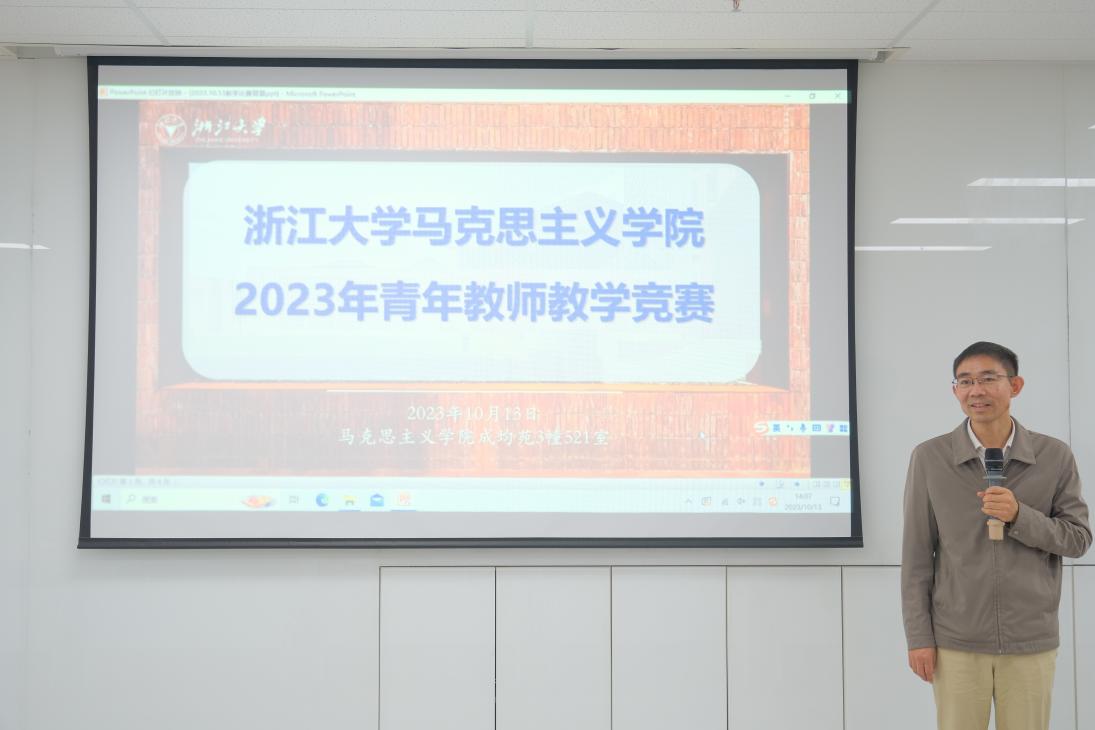 10月13日下午,浙江大学马克思主义学院2023年青年教师教学竞赛于成均苑3幢521室成功举办。学院副院长刘召峰老师、“毛泽东思想和中国特色社会主义理论体系概论”教研中心主任傅夏仙老师,“中国近现代史纲要”教研中心主任董海樱老师、原“中国近现代史纲要”教研中心主任赵晖老师和学校本科教学督导宇正香老师担任评委。活动由副院长刘召峰老师主持。