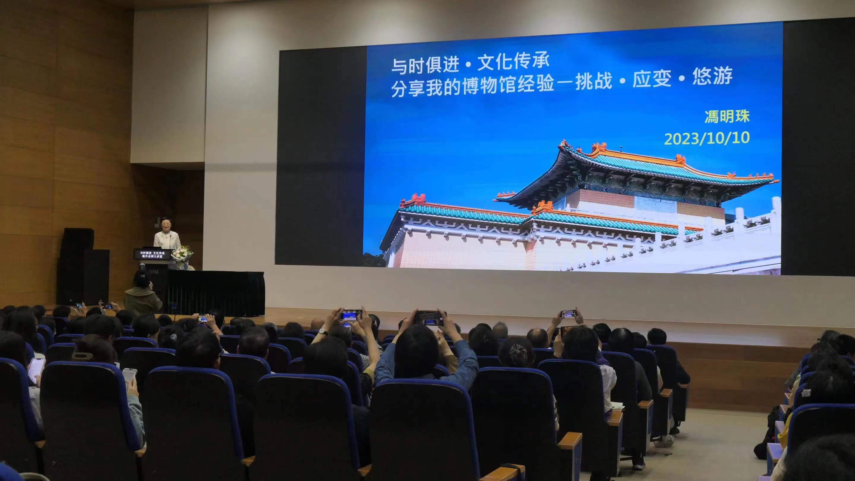 讲座开始,冯女士讲述了历史上的今天:1925年10月10日,紫禁城作为故宫博物院首次开放。恰逢故宫98岁生日,冯女士分享了她与故宫的不解之缘:“我一生未换的工作是文博事业,如同老故宫人一样,终其一生念兹在兹故宫事。”自1972年与故宫连线,到2016退休至今,冯女士情系故宫50余年。她先抛出了一个有趣的公式:博物馆(记忆+创意)=社会变革,由此向观众们介绍了故宫博物院的历史变迁,以“与时俱进·文化传承”为题,报告了台北故宫博物院面对挑战与其应变。