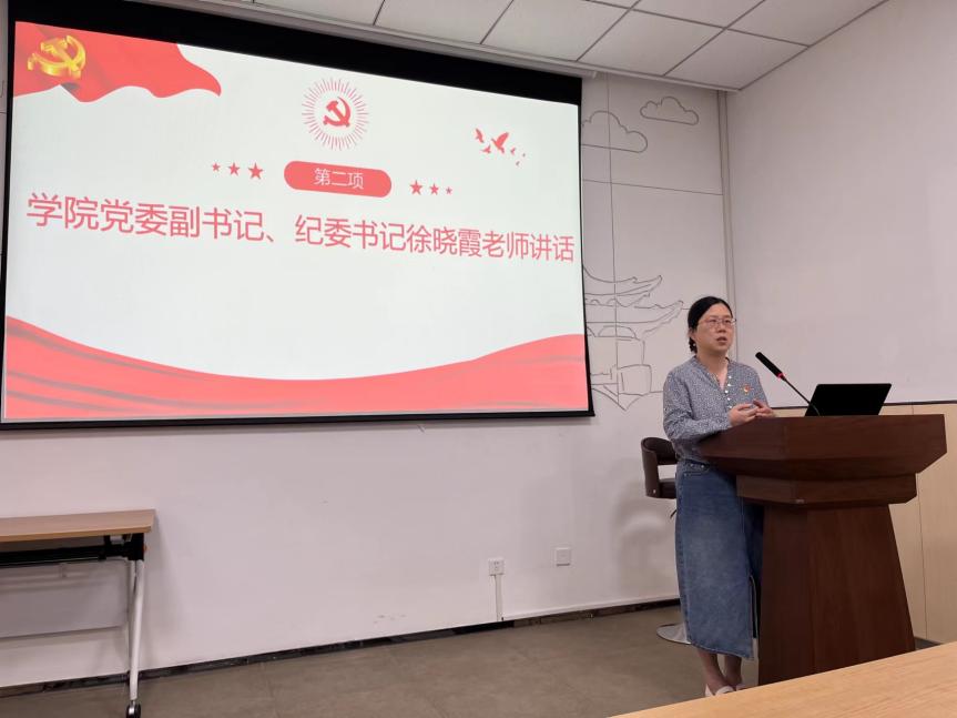 党员大会的第二项议程是开展党支部支委会工作调整大会。学院党委副书记、纪委书记徐晓霞老师发表讲话。徐老师对过去一年支部建设取得的成果作出了肯定的评价,并对全体党员提出了新的要求与期许。她表示,希望硕士生第二党支部继续发扬优良传统,勇担使命、接续进步,推动支部建设工作迈上更高台阶;希望党员同志们积极参加各类学术活动,实现自我成长,并在日常的学习与生活中时刻发挥党员的模范带头作用。
