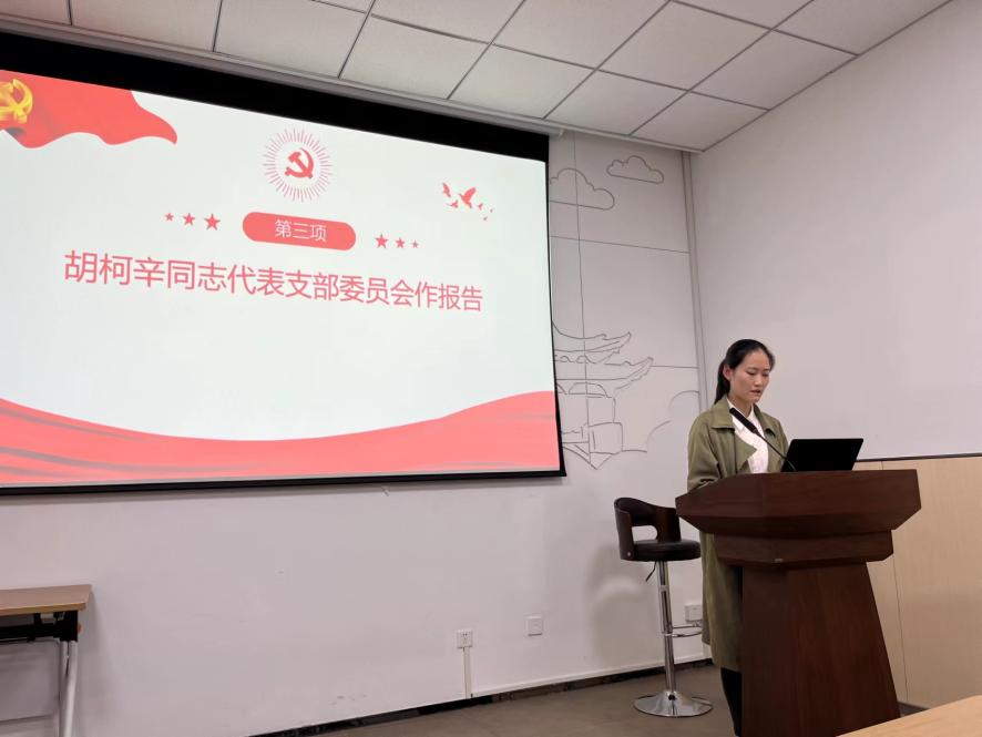 胡柯辛同志代表支部委员会作工作报告。报告指出,过去一年里,在支部委员会的带领下,支部注重运用科学严谨的工作方法,建立了规范健全的组织生活机制,并在诸多方面取得了优异的工作实绩。全体党员同志审议并一致通过了工作报告。