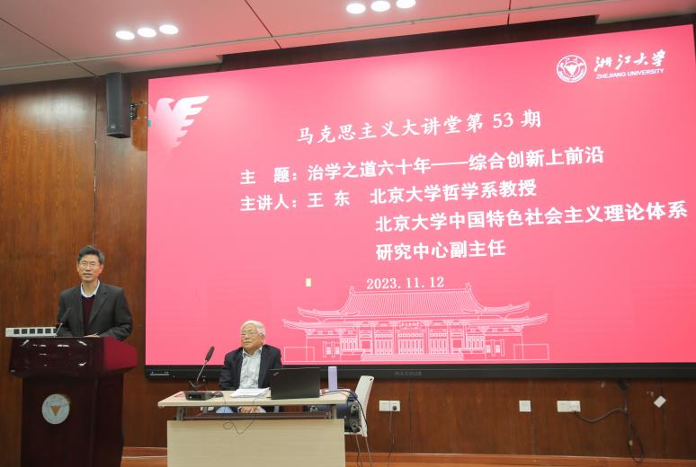 11月12日,浙江大学马克思主义大讲堂第53期在成均苑2幢100报告厅顺利举行。北京大学中国特色社会主义理论体系研究中心副主任、哲学系教授王东受邀作“治学之道六十年——综合创新上前沿”主题讲座。本次讲座由浙江大学马克思主义学院成龙教授主持,师生代表70余人聆听讲座。