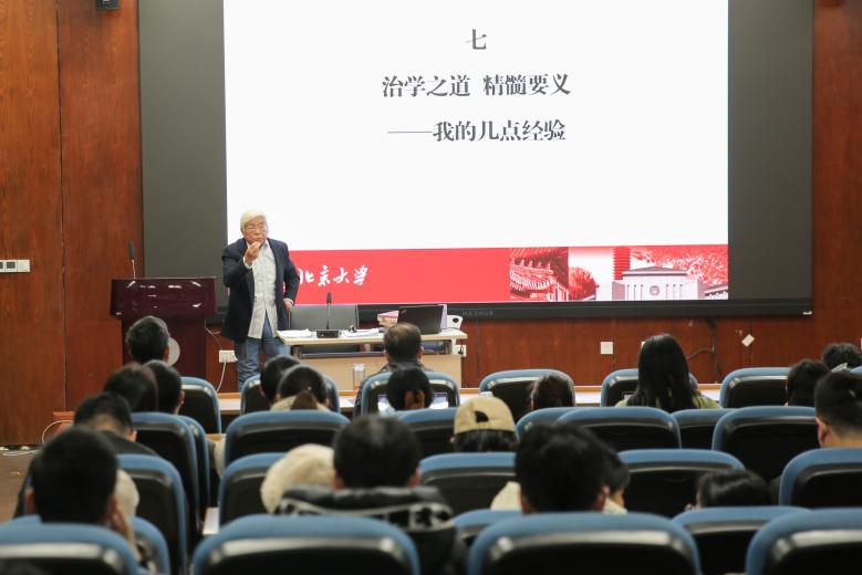 王东教授以风趣幽默的口吻讲述了自己六十余年的治学之道。首先,王东教授将自己的治学经历分为六个阶段:1961至1968年的中学时代——立志研究马列,理想信仰扎根;1968至1978年的知青时代——十年磨难永不言弃;八十年代“三十而立”进大学——厚积薄发上前沿、求创新;九十年代“五十而知天命”——回归中国,“两个结合”;新世纪头十年“六十而顺”——融汇中西马,创造新哲学、新文化;新时代近十年——学习乐趣养生法,创造高峰四十年。其次,王东教授介绍了自己的主要研究方法,即发现问题法、学术立足法、辨章学术法、文献先行法、目录学入门法、版本学奠基法和论文定位法,鼓励师生用好研究方法开展研究。最后,围绕治学之道精髓要义,王东教授认为做学问一是要善于把握研究潮头、探寻研究源头,并一以贯之;二是要把文献研究作为基点,基本理论创新作为重点,解决现实问题作为归属点。他以“读万卷书,行万里路,交好朋友,做大学问”寄语师生,鼓励大家以更为饱满的热情投入到学术研究中去。