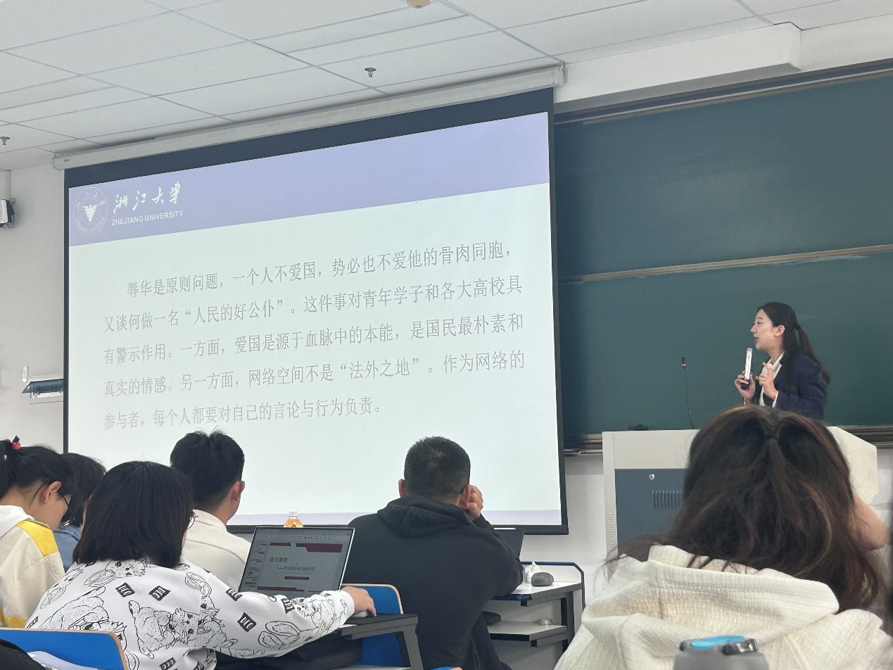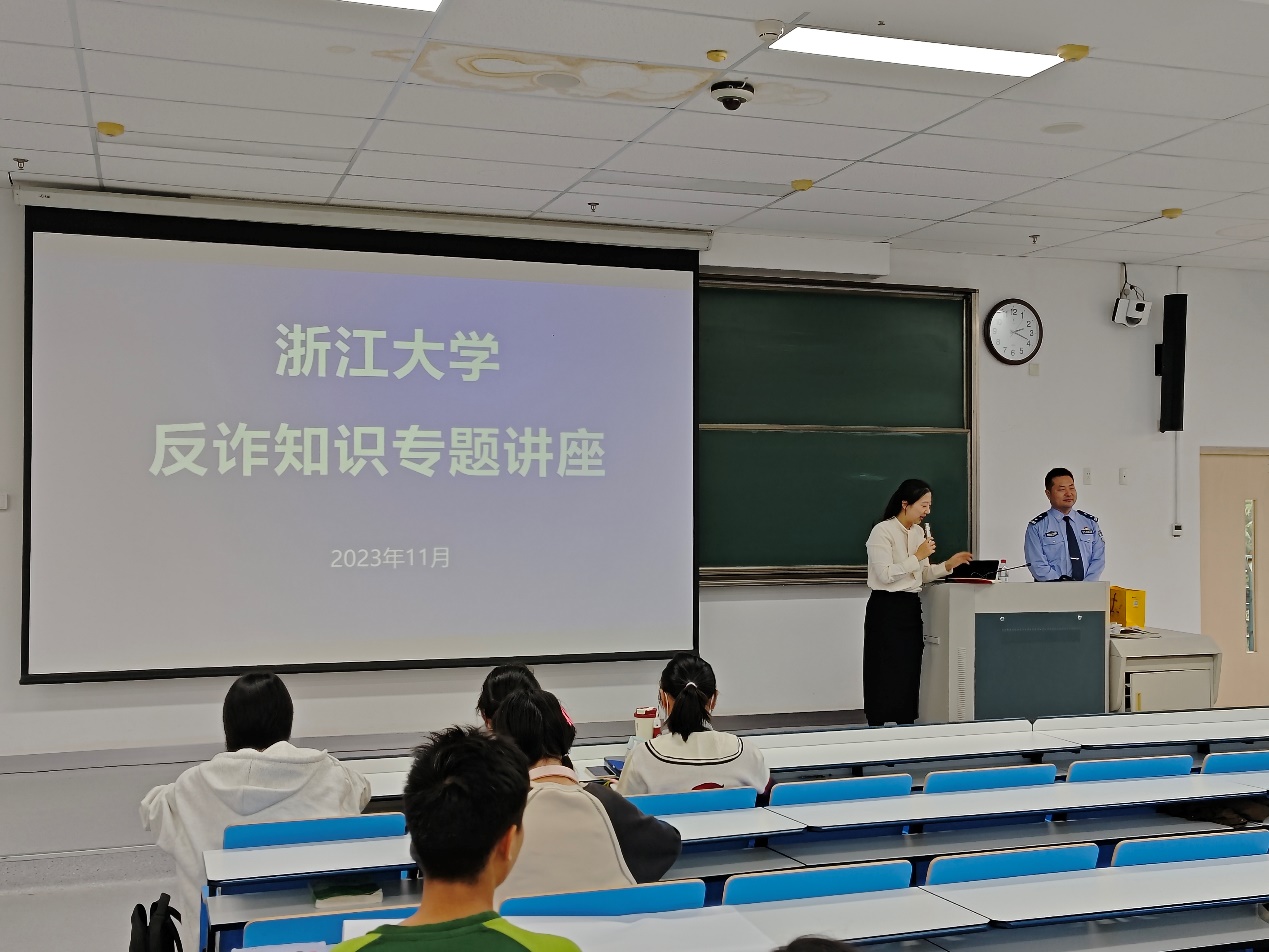 为了进一步提高大学生安全使用网络和文明使用网络意识,浙江大学思想道德与法治课程组邀请杭州市公安局刑侦支队六大队二中队中队长、反诈中心首席宣讲师罗永此为同学们做反诈知识专题宣讲,在讲座后浙江大学马克思主义学院的姚明明老师以案例教学的方式对同学们进行了网络文明教育。本次宣讲和案例教学覆盖11月7日上午和11月8日5个时间段10节课程16个教学班,受益学生900余人。