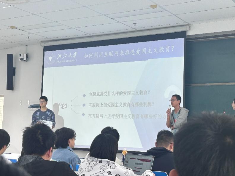 课程的第二环节是以网络文明为主题,由思想道德与法治课堂专题授课组姚明明老师主讲。姚老师创新地引入商学院常用的案例教学方式,通过“案例介绍与热身、案例内容阅读与回顾、小组讨论与发言、案例小结”四个环节展开。姚老师以网络事件为讨论案例,设置了“当代大学生为什么要具备网络道德素养”“如何培养大学生网络道德素养”“如何利用互联网来推进爱国主义教育”三个思考问题为切入口,引导同学们自主思考、自主讨论、自主分享,有效地调动起同学们的热情和积极性,引发同学们的思考与探索。在讨论结束后,姚老师从认知到理论再到实践三个维度进行案例教学总结,加深了同学们对文明使用网络的认识。