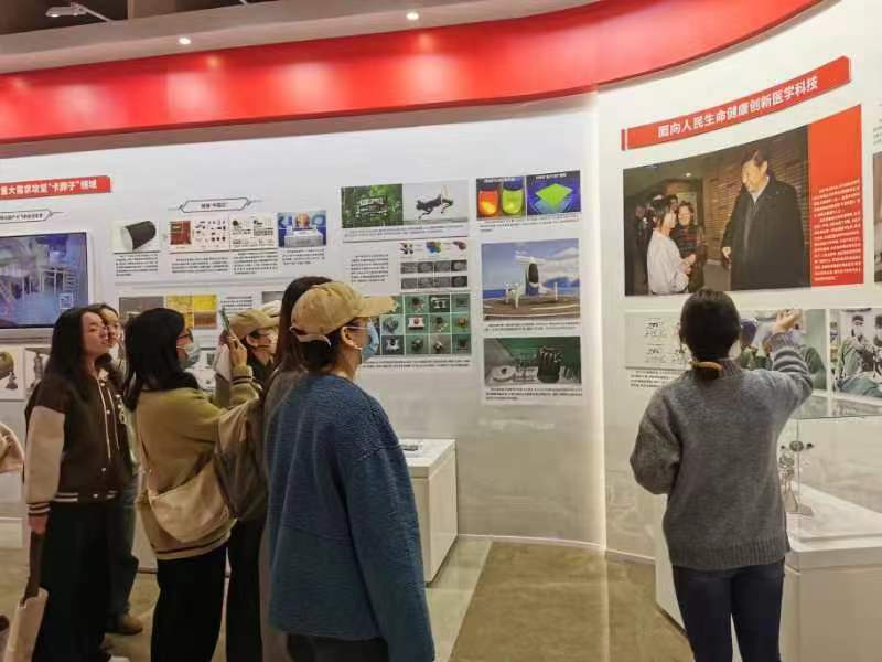 其次,同学们对科技创新成果板块进行了重点参观。创新是世界一流大学的灵魂和核心竞争力。浙江大学坚持“四个面向”,服务“国之大者”,集中力量加强关键核心技术攻关突破,培育重大原创成果,为创新型国家和世界科技强国建设提供强劲支撑。