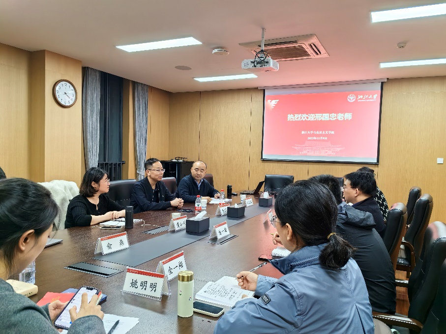 2023年11月9日,北京师范大学马克思主义学院邢国忠教授受邀到我院进行思想政治理论课教学改革经验分享,并与我院思政所教师进行教学备课,活动由代玉启老师主持。