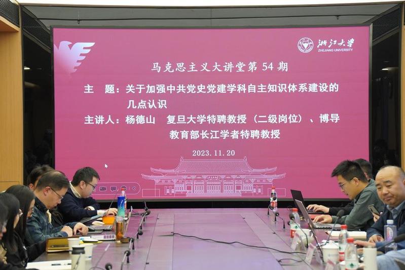 11月20日,浙江大学马克思主义大讲堂第54期在成均苑3幢502会议室顺利举行。复旦大学特聘教授、马克思主义学院博士生导师,教育部长江学者特聘教授杨德山教授受邀作“关于加强中共党史党建学科自主知识体系建设的几点认识”主题讲座。讲座由马克思主义学院博士生导师、中共党史党建研究所所长段治文教授主持,马克思主义学院副院长代玉启教授、刘召峰教授,学院师生40余人参加了本次讲座。