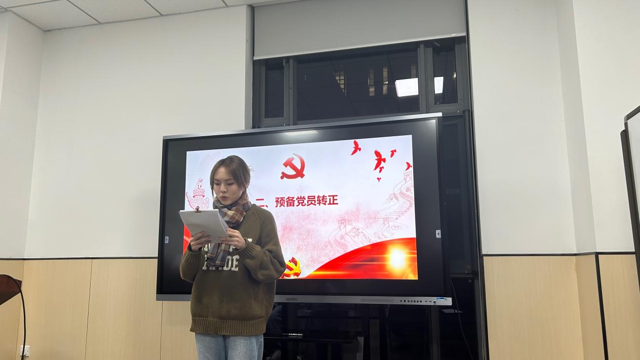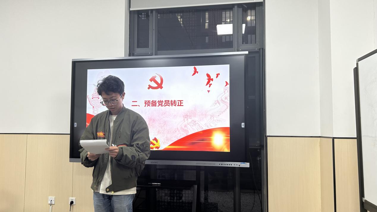 会议第二项,预备党员汇报和转正投票表决阶段。夏鑫雨、唐缘同志分别就自己的入党动机、对党的认知以及自身学习情况、工作情况等信息进行了汇报。两位同志的入党介绍人张诚、刘泽、张丹丹同志依次介绍了发展对象的培养情况并进行了点评,对其能否入党发表了意见。随后,高强同志代表支委会汇报了两名发展对象的政治审查情况和联系培养情况。与会正式党员随后就接收两名发展对象为预备党员投票表决。经投票表决,党支部同意接收两位同志为预备党员。