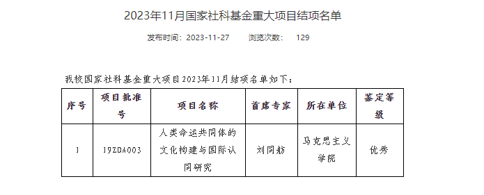 近日,从全国哲学社会科学工作办公室获悉,我院院长刘同舫教授为首席专家的国家社科基金重大项目《人类命运共同体的文化构建与国际认同研究》(19ZDA003)顺利通过结题鉴定,鉴定等级为“优秀”。