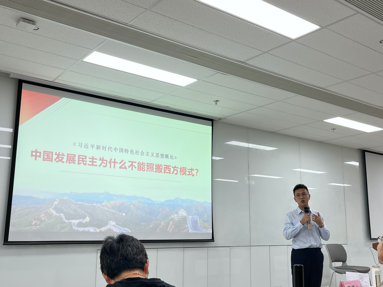 陈晓伟老师从“中国发展民主为什么不能照搬西方模式?”这一问题出发,围绕“西式民主是民主的全部吗?不走西式民主的道路就是‘误入歧途’吗?为什么要走中国特色的民主发展道路?”三个问题,在对以上问题一一解答中论证了全过程民主的优越性和必要性。陈老师以富有激情的讲课风格、精心设计的讲课环节、详实清晰的内容结构给评委和观摩学习教师留下深刻印象。