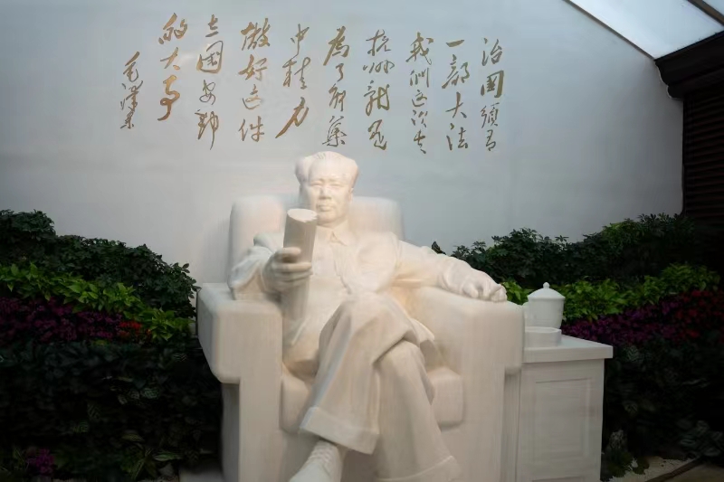 走入陈列馆后,全体师生依序参观了一楼毛泽东主席起草宪法时的会议室、办公室,展列历史事迹的走廊,以及序厅中央伟岸的毛主席雕像。房间里摆放着的家具都是当初毛泽东主席使用的原件,桌子和书柜里的书籍也大多是宪法起草的重要参考资料。在毛主席雕像背后的一段话点出宪法与杭州的不解之缘:“治国,须有一部大法。我们这次去杭州,就是为了能集中精力做好这件立国安邦的大事。”