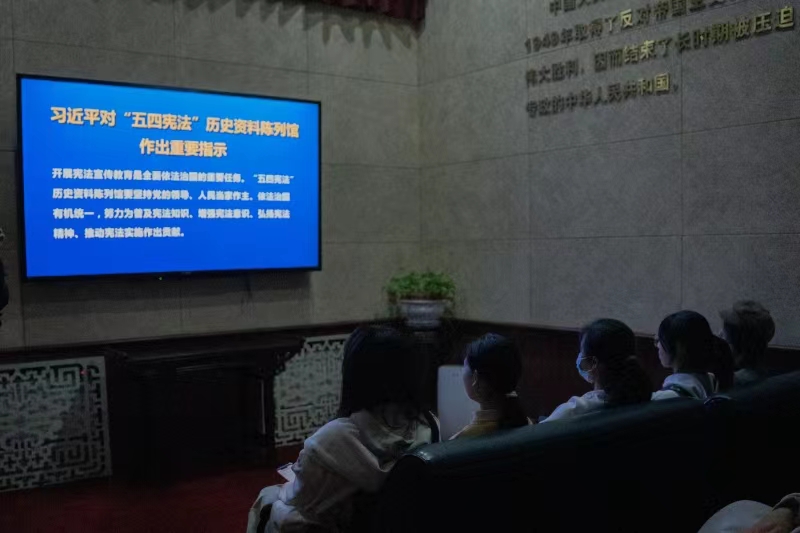 在陈列馆二楼,同学们通过了解宪法起草的完整故事、宪法手稿、会议影像记录等历史资料,既深刻感知了五四宪法从起草到敲定的历程之艰辛,又切实体会了毛泽东主席领导的宪法起草小组时的任务之艰巨。