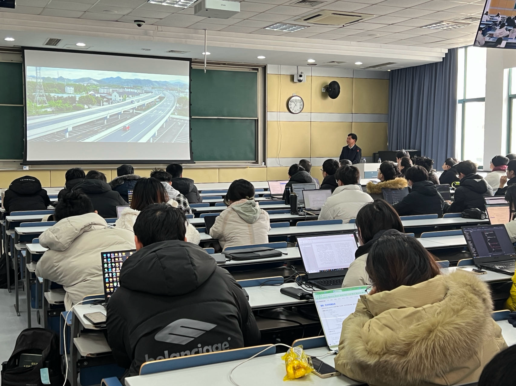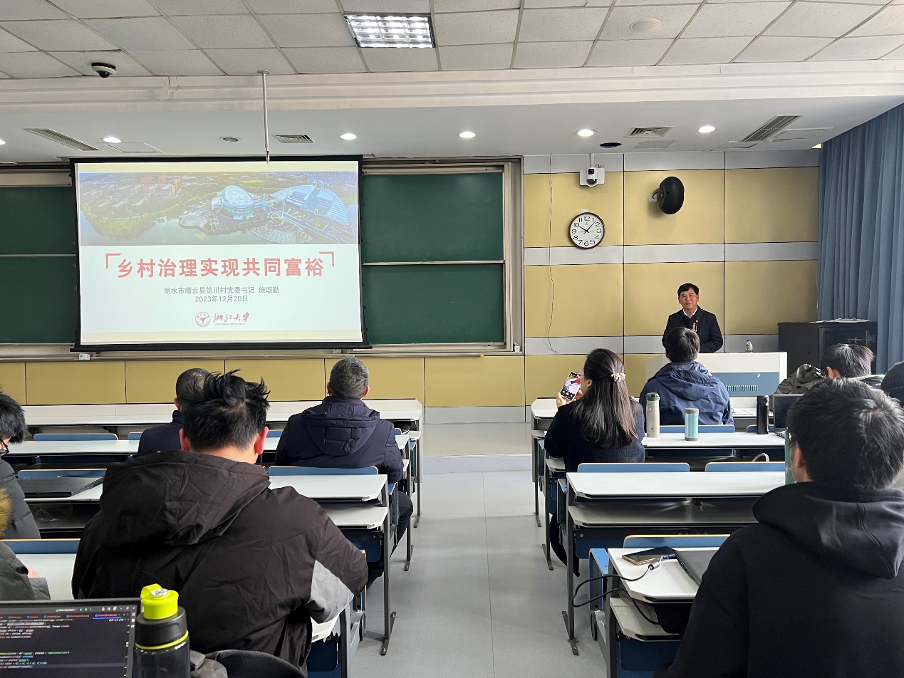 2023年12月20日上午第345节课,玉泉校区教九-206教室,迎来了丽水市缙云县笕川村党委书记施颂勤。施颂勤书记从1992年开始担任村党支部书记,把一个曾经负债20多万的贫穷落后的村庄发展为集体经济总收入达到930万元的远近闻名的富裕村。从2003年开始他先后担任缙云县、丽水市、浙江省人大代表,获得浙江省担当作为好书记、省级兴村(治社)名师、浙江省优秀党务工作者等荣誉。施书记以《乡村治理实现共同富裕》为主题,向同学们讲述带动村庄发展、探路共同富裕的生动故事,栩栩如生地描绘了一幅美丽村庄、美丽经济、美好生活的和谐、美丽、富裕的浙江农村画面。