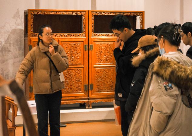 在“屏居佳器——周孝先、胡秀莲伉俪捐赠家具展”,同学们领略了中国传统家具的艺术世界。明式黄花梨家具和清式紫檀家具大气端庄又兼具精巧细致,徜徉于展厅,经典场景空间陈设为同学们带来了中国传统家具艺术魅力的直观体验。