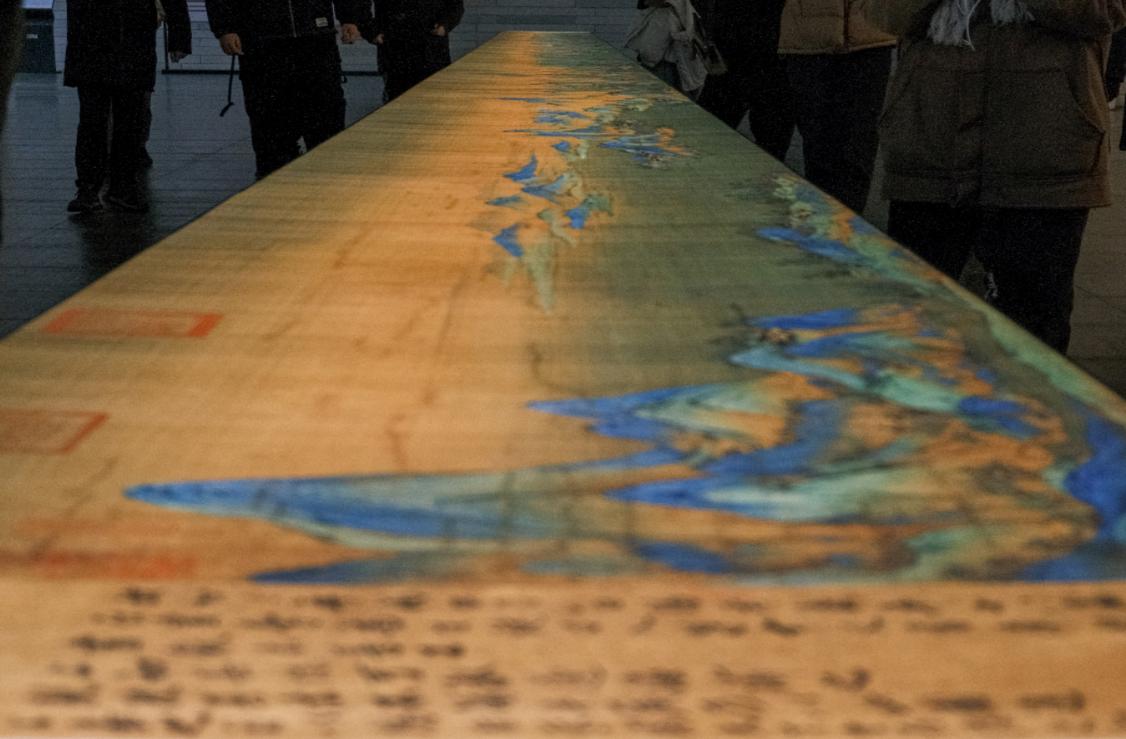 在参观最后,长卷的《千里江山图》吸引了同学们驻足脚步。画家王希孟运用细腻技法以长卷形式描绘出一幅美妙的江南山水图,画作既严密紧凑又疏落有致,显示出的咫尺千里空间美学尤令同学们赞叹。