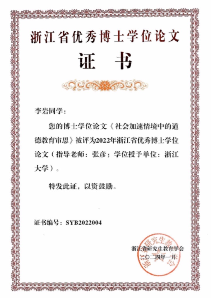 近期,浙江省研究生教育学会发布了《关于表彰2022年浙江省优秀博士学位论文和优秀硕士学位论文的决定》,全省共评出63篇浙江省优秀博士学位论文,64篇浙江省优秀博士学位论文提名论文,104篇浙江省优秀硕士学位论文。我院2022届毕业生李岩的博士学位论文《社会加速情境中的道德教育审思》(指导老师:张彦)获评2022年浙江省优秀博士学位论文。