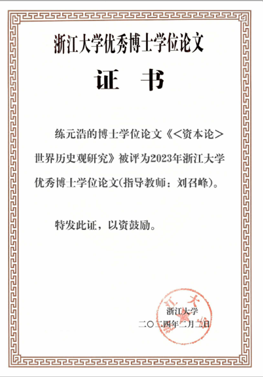 为深化新时代教育评价改革,进一步提升研究生学位论文质量,充分发挥优秀博士学位论文的示范引领作用,根据《浙江大学优秀博士学位论文评选办法(试行)》(浙大发研〔2021〕36号)的规定,学校组织开展了2023年优秀博士学位论文评选工作。我院2023届毕业生练元浩的博士学位论文《<资本论>世界历史观研究》(指导教师:刘召峰)获评2023年浙江大学优秀博士学位论文。
