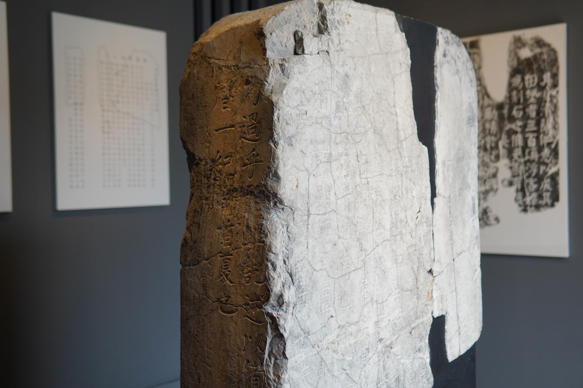 展厅的一角有一块具有裂痕的石碑,在讲解老师的解说下,同学们了解到它是颜真卿书修恽西亭记残碑,是艺博馆的“镇馆之宝”。这件碑文是颜真卿宦游湖州时期的字迹,石碑上苍劲有力、博大雄浑的落笔,是书法家光明磊落、刚正不阿的气度与胸襟的流露。深厚的功力背后,是其持之以恒的临摹与创作的体现,也是其博学多才的修养与文化的积累。颜真卿书法的凛然忠义之气,体现了盛唐庄重恢宏的气象,其背后的精神值得我们学习与借鉴。