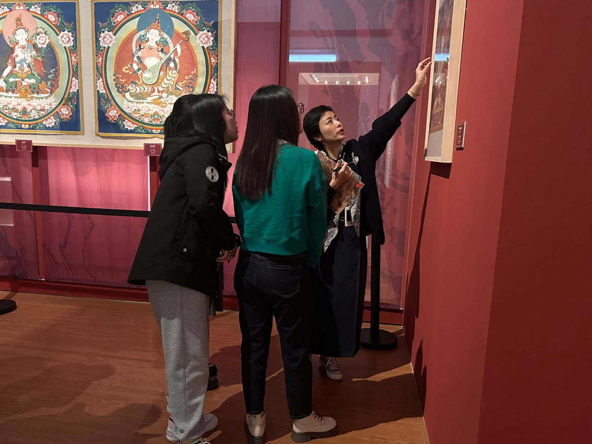 在“折枝入瓶——宋人的花事与瓶赏”展览中,同学们欣赏了以宋元时期为主的陶瓷花器,通过青绿与梅红的视觉呈现,感受到宋代花事繁盛。各种陶瓷也反映出宋代士人与民众精致、典雅的审美意趣与生活追求。“珠峰脚下的艺术遗珍”展示了具有地域与民族特色的擦擦、石刻拓片、唐卡等艺术品。讲解老师讲述了唐卡从矿石传统工艺研磨到丹青化彩,再凝聚成庄严妙相的画作的过程以及画师斋戒的虔诚和倾注的匠心。形式多样的展品体现了精湛的绘画技艺与独特的文化内涵,呈现了各民族文化交流与借鉴的动人历史画卷。