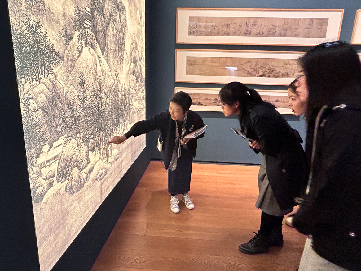 文化是民族的血脉,是人民的精神家园。在参观中,同学们认真听了讲解老师们的讲解并不时提问,有同学发表了自己的感想:“平常会看一些文博的纪录片,与走进博物馆参观有不同的体验,感谢潘老师和讲解老师提供的机会。与文物对话,凝望静思的时刻,体会到了跨越时空的力量。颜真卿的书法与王希孟的千里江山图都是传世名作。书如其人,书为心画,艺术背后更重要的是人品、学养与才华,蔡京的艺术修养虽然很高,但在品德上,我们更应当向颜真卿学习。”以美润心,以文育人,现场教学既是一场视觉盛宴,也是一次心灵的滋养。中华优秀传统文化以独特的魅力与价值,为新时代青年学生以更加饱满的精神状态投入学习生活积蓄了力量。