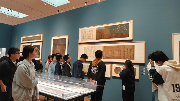 随着导览的脚步,同学们进入展厅四,参观“百代标程—悦读宋韵展”。宋画是自然与人文交融的艺术高峰,其深邃的笔触,不仅描绘出了大自然的壮丽与恢弘,同时也蕴含着丰富的文化内涵和历史价值。同学们深入了解了宋代画家们的创作理念、技法和历史背景。从清晰的山水画到生动的人物画,每一幅作品都展现了宋代艺术家的独到才华和对生活的独特理解。习近平总书记在文化传承发展座谈会上强调:“中国文化源远流长,中华文明博大精深。只有全面深入了解中华文明的历史,才能更有效地推动中华优秀传统文化创造性转化、创新性发展,更有力地推进中国特色社会主义文化建设,建设中华民族现代文明。”同学们在参观中跟随讲解穿越时空往返千年,深深感受到了我国传统文化历久弥新的亘古魅力,树立了文化自信。
