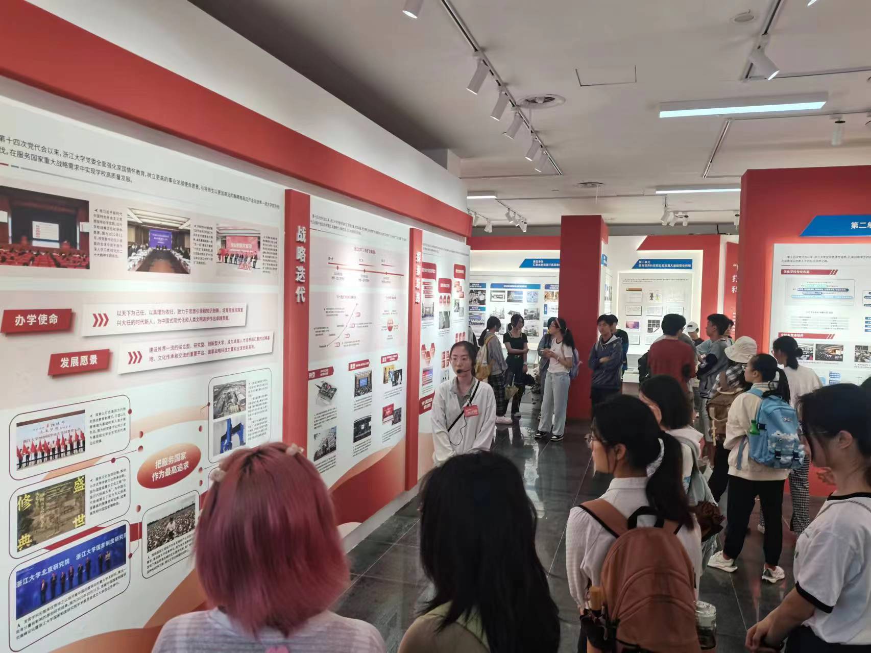 在“浙江大学党建工作主题展”中,学生们探索了五个主题区域,每个区域都通过丰富的资料和生动的故事,展示了浙大师生在不同历史时期的英雄事迹和模范人物。这些故事不仅震撼了在场的每一个人,也极大地激发了他们的信念和决心。