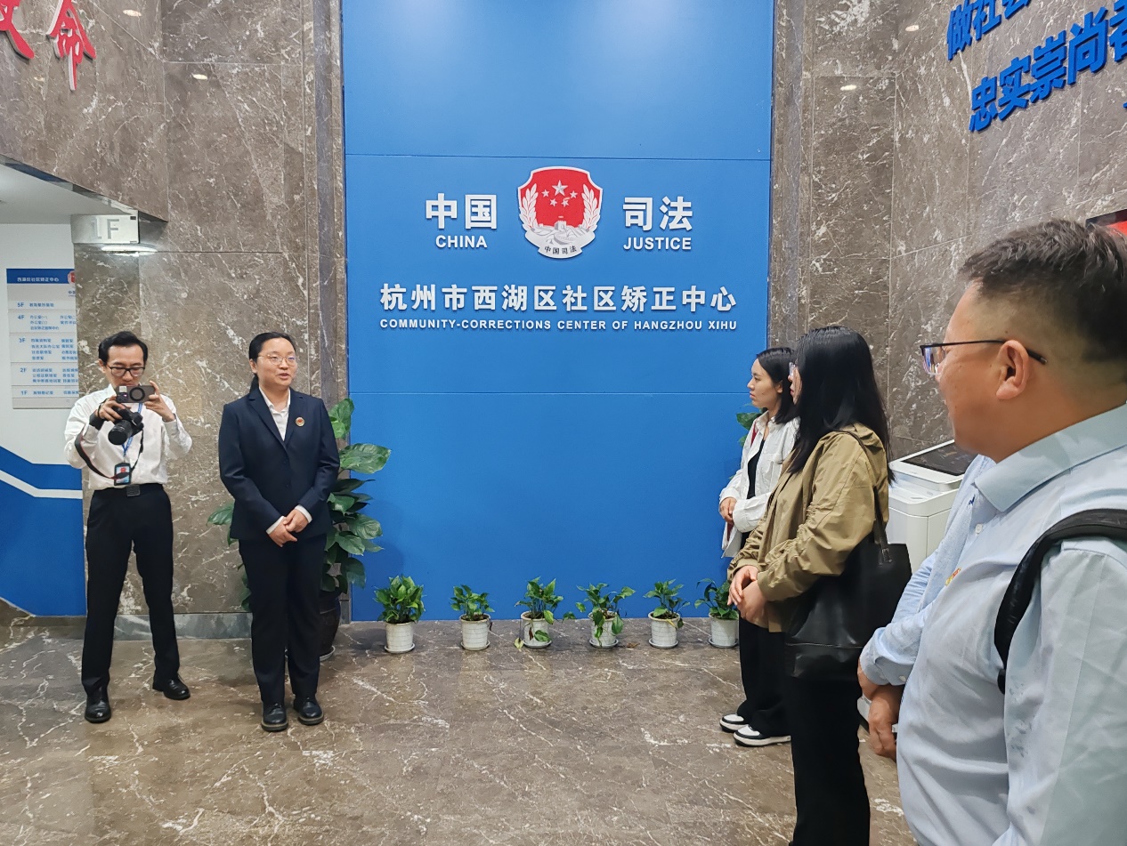 党员们首先来到西湖区社区矫正中心,听取中心规划布局、功能设置、队伍建设、成果展示等情况介绍。矫正中心工作人员讲解了实施社区矫正的目的、社区矫正工作任务、工作流程及西湖区社区矫正工作开展情况。党员们观看了社区矫正工作图片展,参观了矫正宣告室、训诫室“三区十室”等功能管理区和功能室,详细了解各功能室设施配备和管理使用情况,以及社区矫正刑罚执行、监督管理、教育帮扶过程。大家表示:通过参观,对社区矫正有了直观的认识,理解了什么是非监禁刑罚,知晓了社区矫正工作流程,同时也感受感受到杭州社区矫正公正、文明、智慧、温馨的执法教育环境。