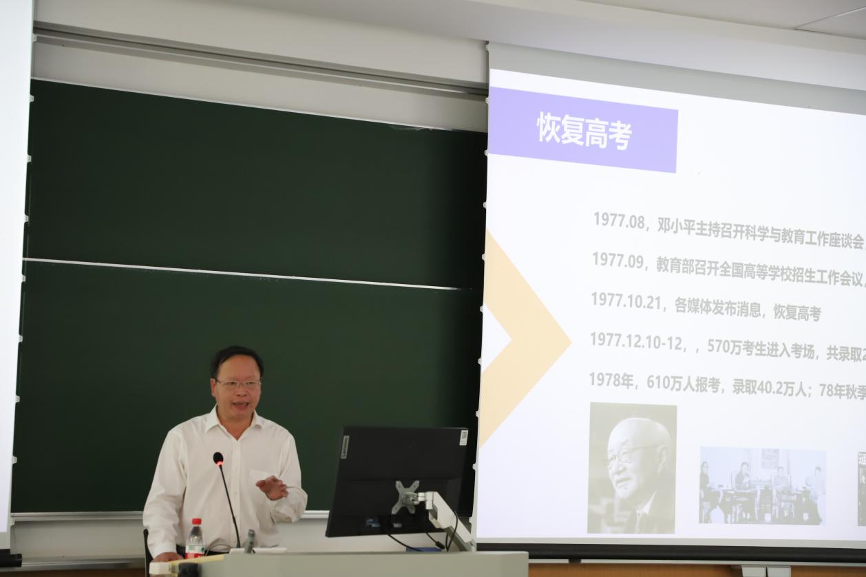 习近平总书记指出:“建设教育强国,龙头是高等教育。”高等教育为中国改革开放提供了有力的人才和智力支持,广大高校师生既是高等教育的亲历者,也是建设者。为了让同学们更加深入了解改革开放以来我国高等教育改革发展的历程,2024年6月13日上午,“中国近现代史纲要”课程邀请到浙江省政协提案委员会副主任,原杭州电子科技大学党委副书记、校长朱泽飞教授进入课堂,围绕“改革开放以来浙江的高等教育”进行专题授课,讲座由马克思主义学院党委书记李小东主持。