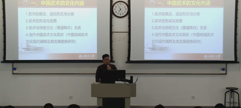 中华武术文化是中国传统文化的重要代表,中华武术的国际传播是中国文化与世界文化交融汇通的主要途径。为了让同学们更深入更具体地了解中国文化的深厚内涵和国际影响力;11月20日晚第11-14节,《中国马克思主义与当代》课程邀请到了浙江师范大学体育学院教授、中国武术六段,武术套路国家一级裁判员郭守靖老师,以“建设社会主义文化强国——中华武术文化的国际传播”为主题,为同学们讲解了中国文化与当代世界文化发展的密切关系。