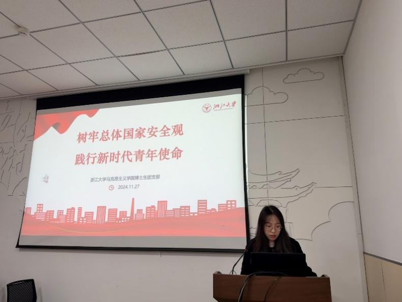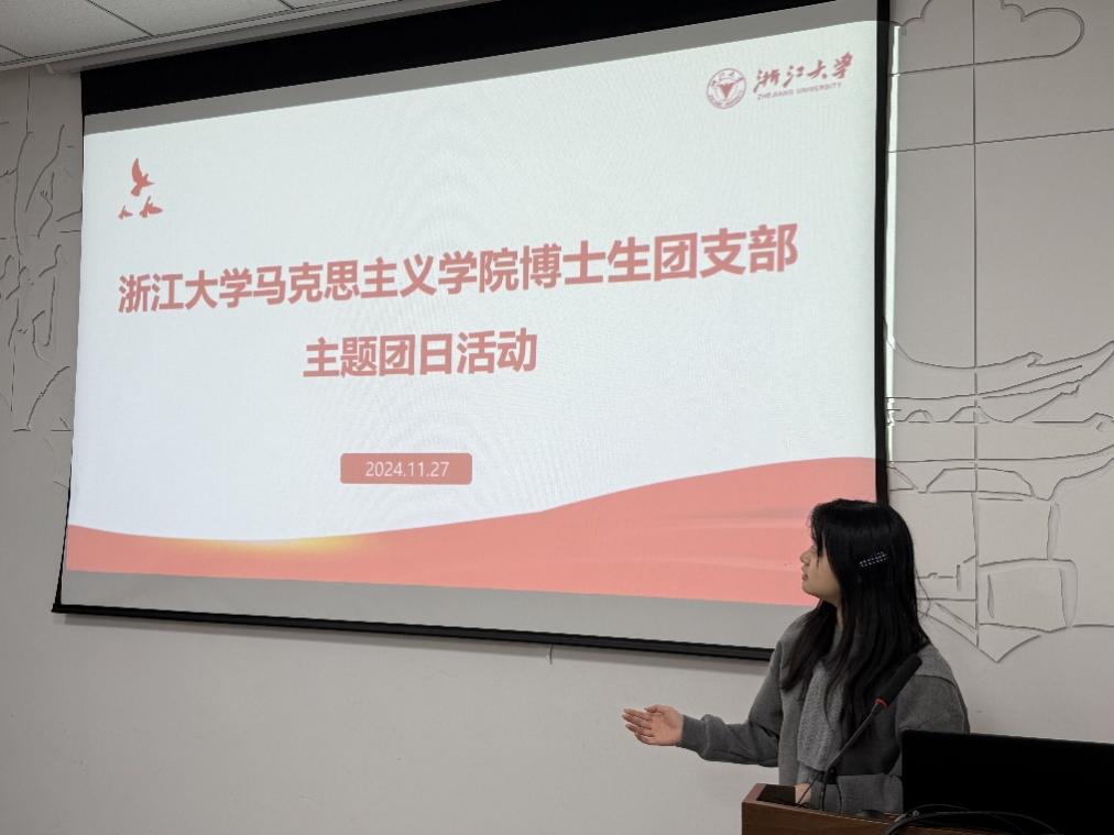 2024年11月27日下午,浙江大学马克思主义学院博士生团支部团日活动在成均苑二幢107室顺利举行。本次活动由团支部书记马婧主持,2024级博士研究生王璜和李琼同学围绕党的二十届三中全会精神、总体国家安全观学习教育两大主题进行了分享。