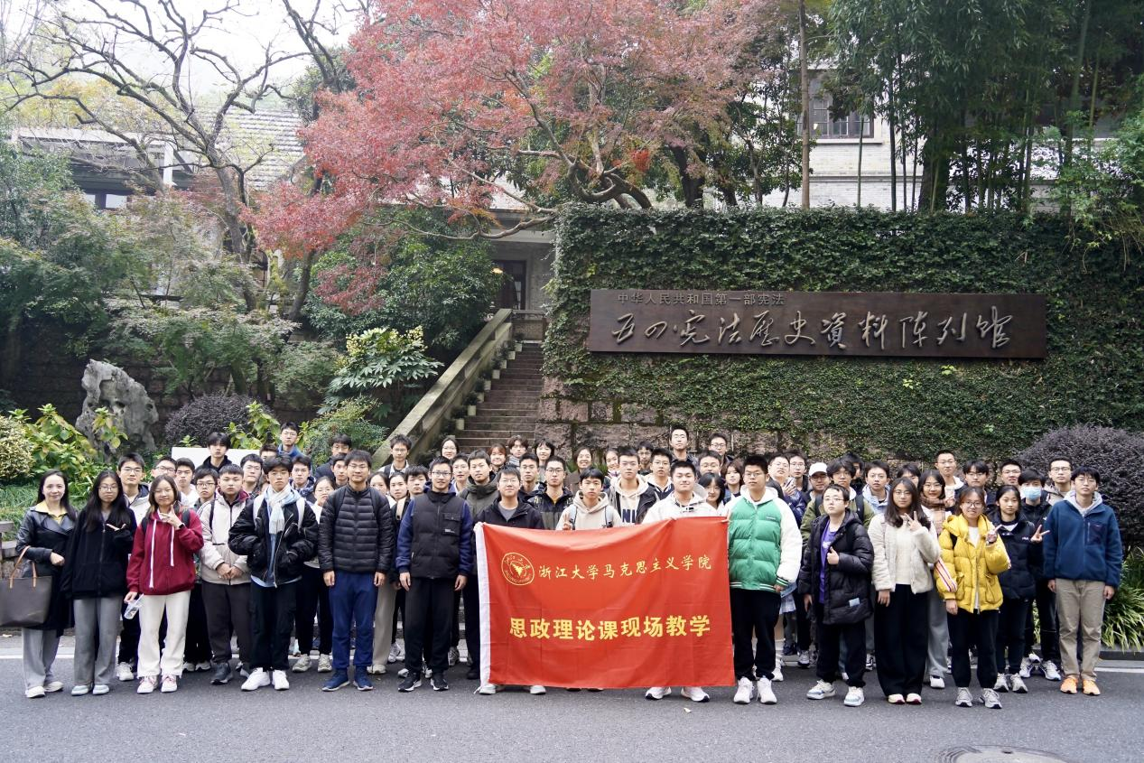 2024年12月3日上午,为了深入了解新中国第一部宪法的制定历程,弘扬宪法精神,蔡晓卫老师带领思想道德与法治课程的60余位学生一同前往五四宪法历史资料陈列馆进行现场教学活动,共同追寻红色足迹,感悟宪法精神。上午十点三十分,一行人抵达位于杭州北山街的五四宪法历史资料陈列馆。该馆以“汉白玉毛主席坐像”为引,通过复原陈列和主题展览,生动地展现了党领导人民制定宪法、实施宪法的真实历程和光辉业绩。