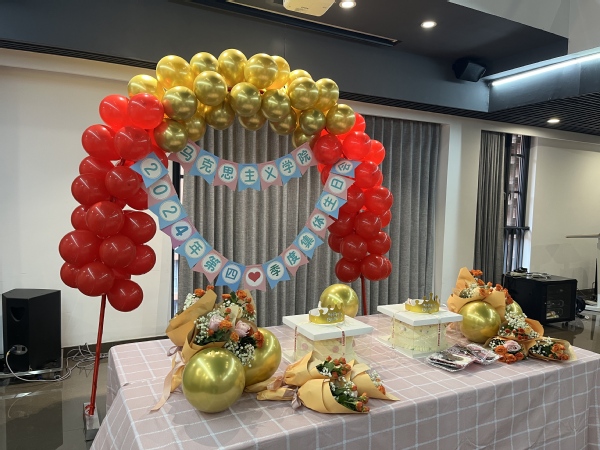 学院工会精心布置了生日会场地,并准备了精美的生日蛋糕、鲜花、餐食以及水果饮料,活动现场充满了浓厚的生日氛围。