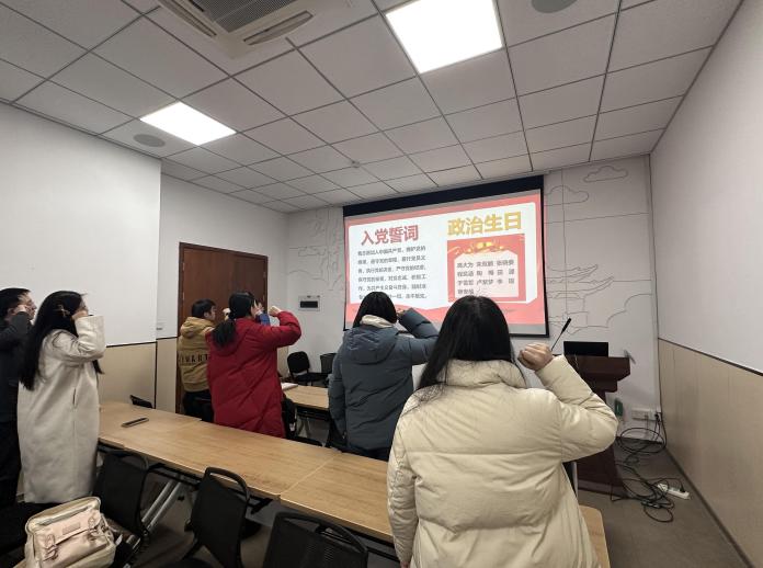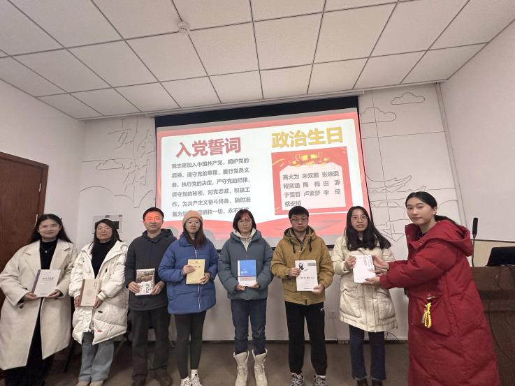 第三环节,重温入党誓词,共过政治生日。党支部为12月入党的同志过政治生日,并为其赠送红色书籍。希望支部党员们牢记自己的“第一身份”,强化了党员意识,激励了广大党员们坚定理想信念和政治信仰。