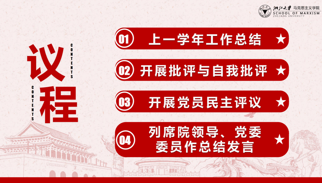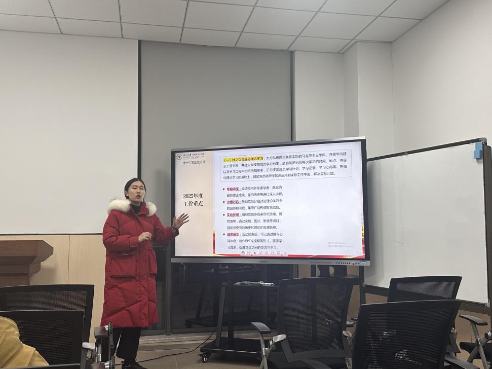 为深入贯彻落实党的二十届三中全会精神,进一步增强党组织的凝聚力和战斗力,提升党员的政治觉悟和党性修养,马克思主义学院博士生第三党支部于2025年02月26日组织开展了“2月组织生活会暨民主评议党员大会”主题党日活动,此次主题党日活动由支部副书记蔡安禧同志主持,分为四个环节。