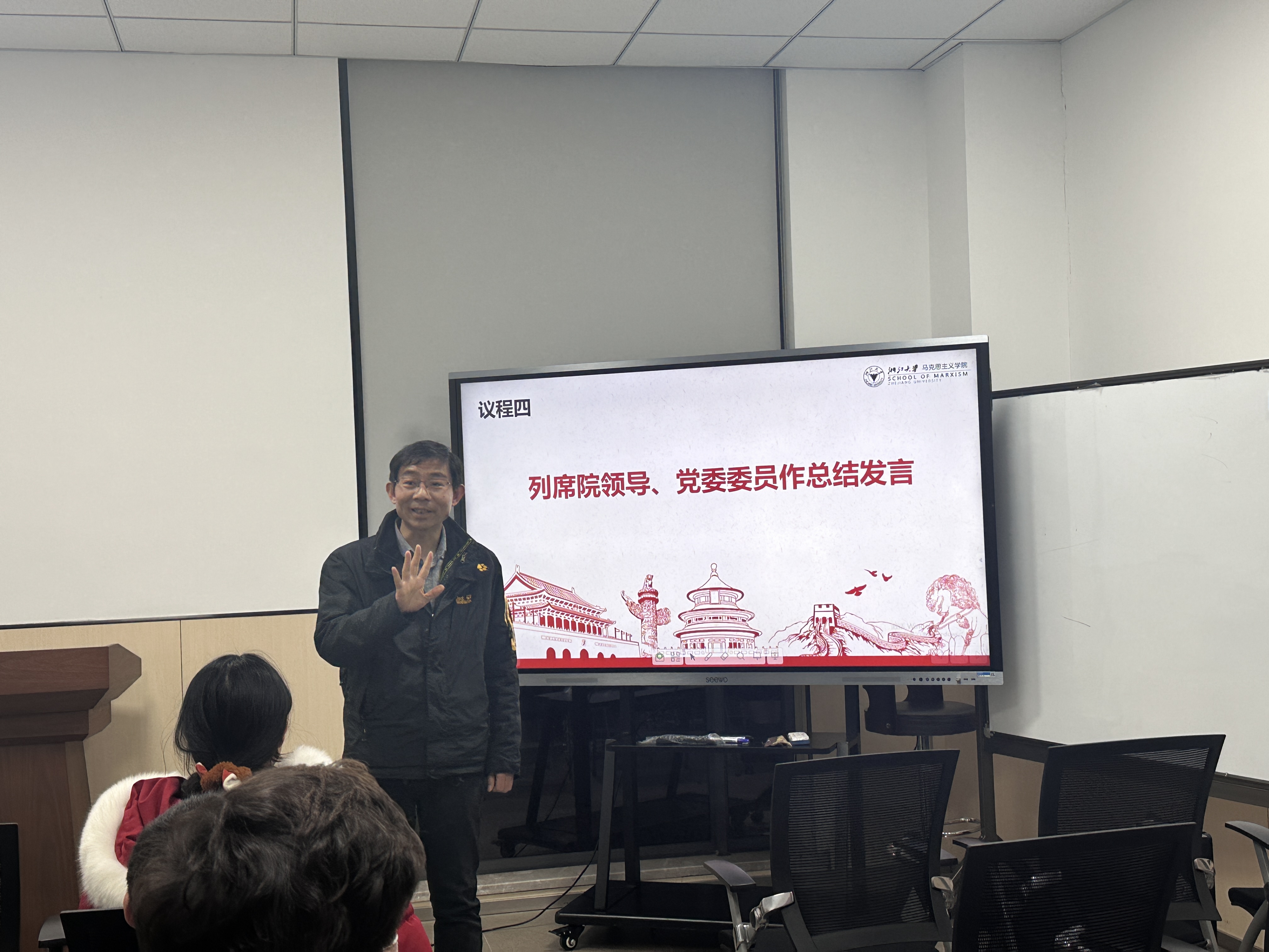 第四环节,支部邀请院领导、党委委员刘召峰老师进行总结发言。刘召峰老师对上一年度支部取得的工作成效予以充分肯定,结合党员同志们批评与自我批评的内容进行点评,并围绕导学关系、学术科研等方面提出建议。