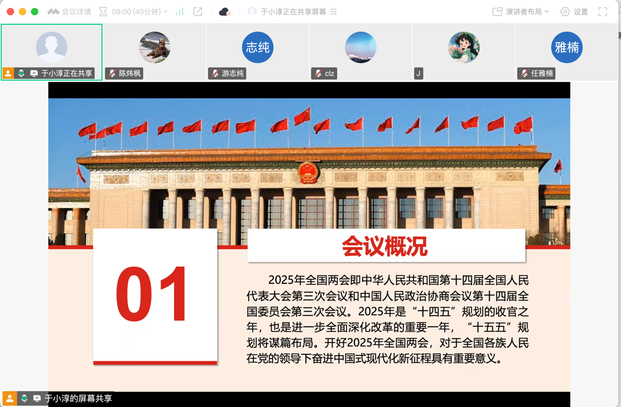 会议第一项议程聚焦2025年全国“两会”精神专题学习。党支部副书记于小淳同志从“会议概况”“讲话精神”“报告内容”“聚焦科研”四部分展开,勉励党员干部要深刻把握“两会”精神的实践要求,要将“两会”精神转化为攻坚克难的行动指南,在服务大局中彰显担当。