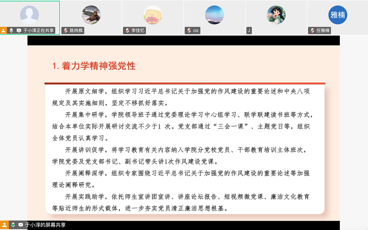 会议第二项议程部署了“深入贯彻中央八项规定精神学习教育”专项工作。党支部副书记于小淳同志传达上级党委关于作风建设的文件精神,要求全体党员干部以“永远在路上”的清醒和坚定,坚持融入日常、抓在经常,确保学有质量、查有力度、改有成效。