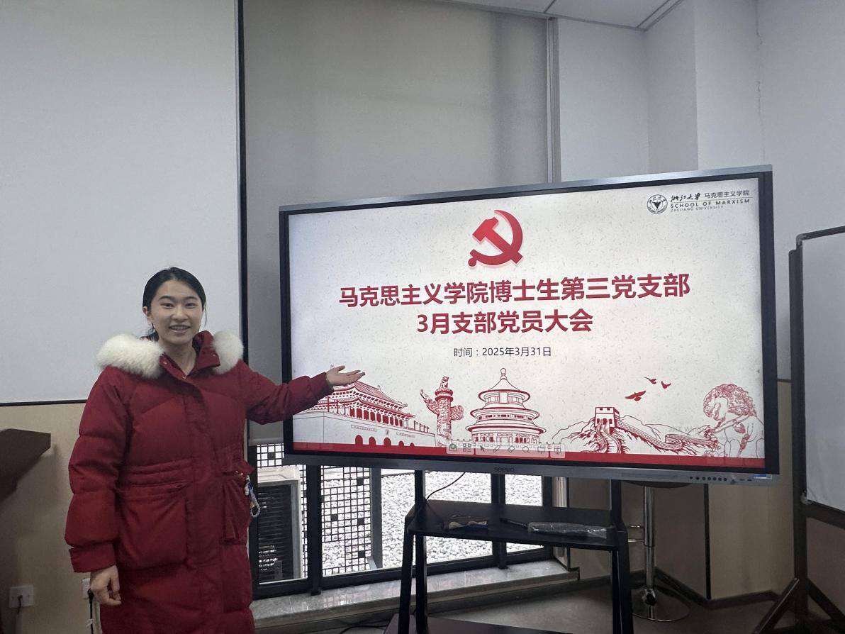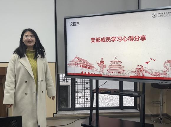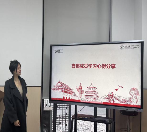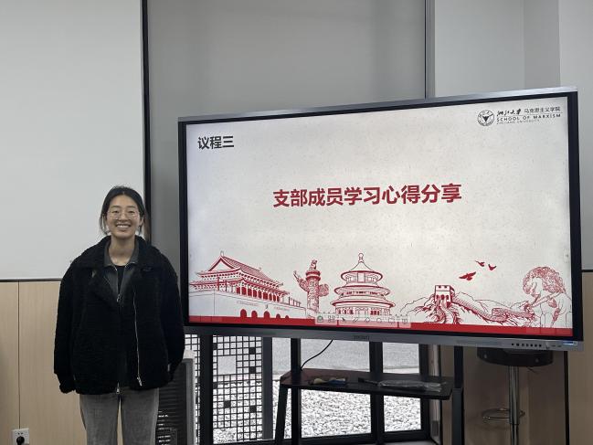 第三环节,支部成员们围绕全国两会精神进行学习心得分享。马婧同志表示,“ 无论是代表们提出的‘有温度的科技创新’,还是将个人奋斗融入国家大局的号召,都激励着我们以专业知识服务社会,以实干精神践行使命。未来,我将以两会精神为指引,立足本职、勇于突破,为强国建设贡献青春力量”。潘亚宁同志提出,“加速推进人工智能塑造新质生产力,需要攻克人工智能关键核心技术、推动数实深度融合、优化人工智能市场竞争环境以及培养创新复合型人才”。卢紫梦同志指出,“报告提出的居民收入增长要和经济增长同步、完善公共服务设施、深化文化惠民工程等,让我感受到以人民为中心正在进一步得到贯彻落实。新的历史坐标,新的时代使命,浙大学子更应兼总条贯,知至知终,向着中国式现代化奋力进发”。
