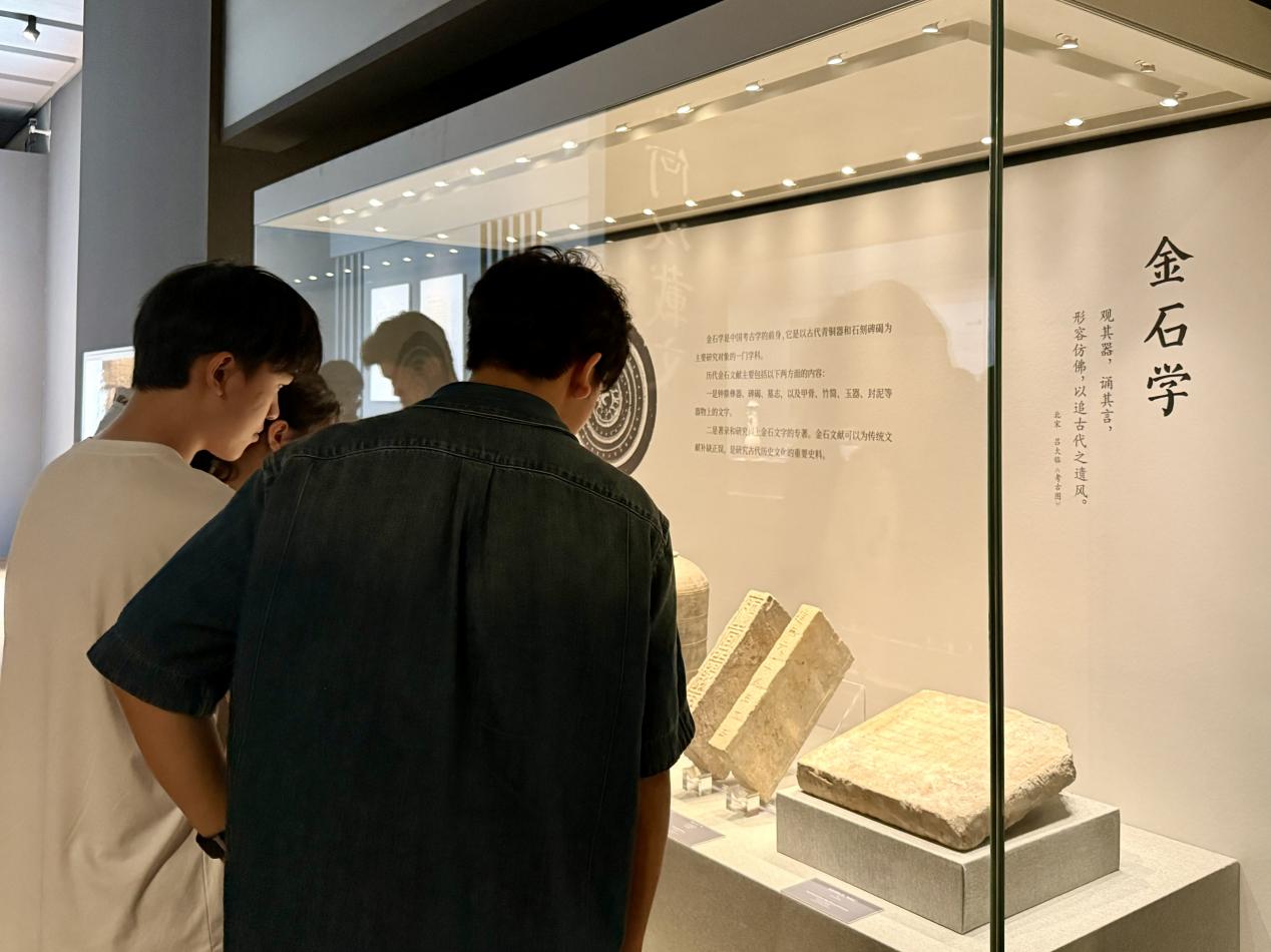 在“何以载文”单元,镇馆之宝——颜真卿刻字石碑真迹静静矗立。师生们驻足碑前,屏息凝视,感受颜真卿书法的磅礴气势与深沉情感。颜真卿的书法雄伟奔腾,笔笔力透纸背,气韵生动,展现了独特的艺术风格与人格魅力。书法作为中国传统文化的重要组成部分,承载着中华民族的精神与文化内涵,是情感的表达和精神的寄托。颜真卿的书法作品不仅是艺术的瑰宝,更是中华民族精神的象征。他以笔墨为武器,书写出对国家和民族的忠诚与担当,展现了中华民族不屈不挠的精神风貌和高尚的道德情操。