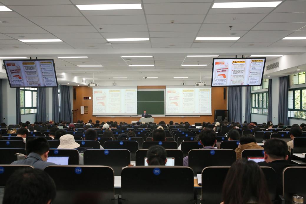中共党史党建研究所所长段治文教授为全体师生党员讲授“深入学习领会习近平关于党的建设重要思想”专题党课。段治文教授提纲挈领,为师生们介绍了习近平关于党的建设重要思想“十三个坚持”的理论体系和“四个具有”的理论特色,重点讲解了中央八项规定精神以及高校落实“中央八项规定精神”需要注意的几个方面,由此指出全面从严治党永远在路上,党的自我革命永远在路上,必须持之以恒推进全面从严治党,深入推进新时代党的建设新的伟大工程。随后,段治文教授就“坚持党的全面领导”“坚持人民至上”“坚持自我革命”“坚持‘六大建设’”“坚持反腐败”等习近平党的建设重要思想的几个重要方面进行了一一阐释,为学院师生带来了一场精彩的思想盛宴。