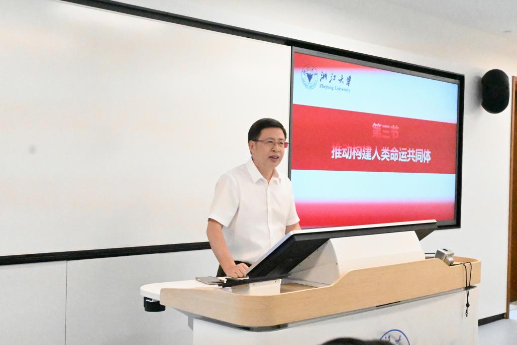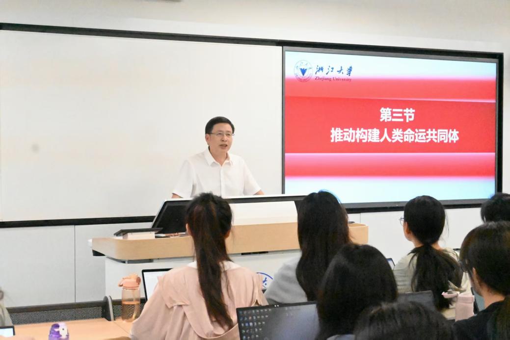 2025年5月7日上午,马克思主义学院首期“习近平新时代中国特色社会主义思想概论”课程名师大讲堂活动在紫金港校区北3-319教室举行,马克思主义学院院长刘同舫教授为学习“习近平新时代中国特色社会主义思想概论”课程的本科生,作了“第十六章 中国特色大国外交和推动构建人类命运共同体”中“第三节 推动构建人类命运共同体”内容的专题讲座。
