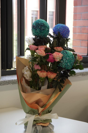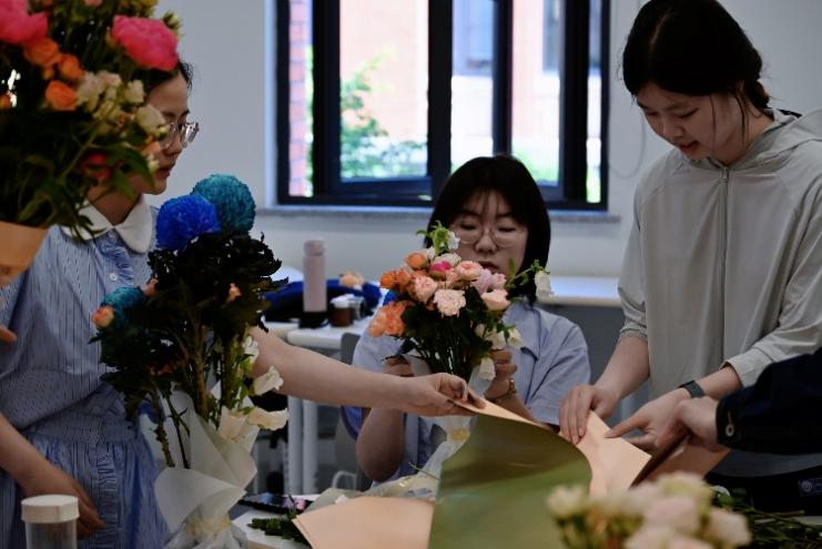 活动当日,同学们分工合作,精心搭配包装各色鲜花。折叠彩纸、裁剪丝带、修剪花枝……大家一边操作一边交流着技巧与心得,现场气氛温馨而热烈。在同学们的巧手下,一束束充满爱意的花束逐渐成型。每一束花都独具匠心,如同同学们对阿姨们的感恩之心般真挚而独特。包装好的花束被小心翼翼地放置在一旁,等待着传递到阿姨们的手中。