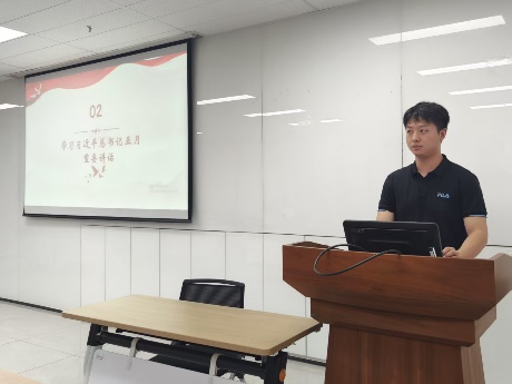 袁漫兮同志以“弘扬劳模精神,奋进中国式现代化新征程”为主题,领学《在庆祝中华全国总工会成立100周年暨全国劳动模范和先进工作者表彰大会上的讲话》。袁漫兮同志首先追溯了习近平总书记关于劳动精神重要论述的发展脉络,就“劳模精神展现工人阶级伟大品格”“工匠精神赋能科技自立自强”分享了个人学习感悟,并结合理论学习和社会实践,为支部成员践行劳动精神提出了具体的实践路径,号召青年党员要以劳动精神作为奋斗指引,保持学习知识的渴望,在实践中锤炼本领。