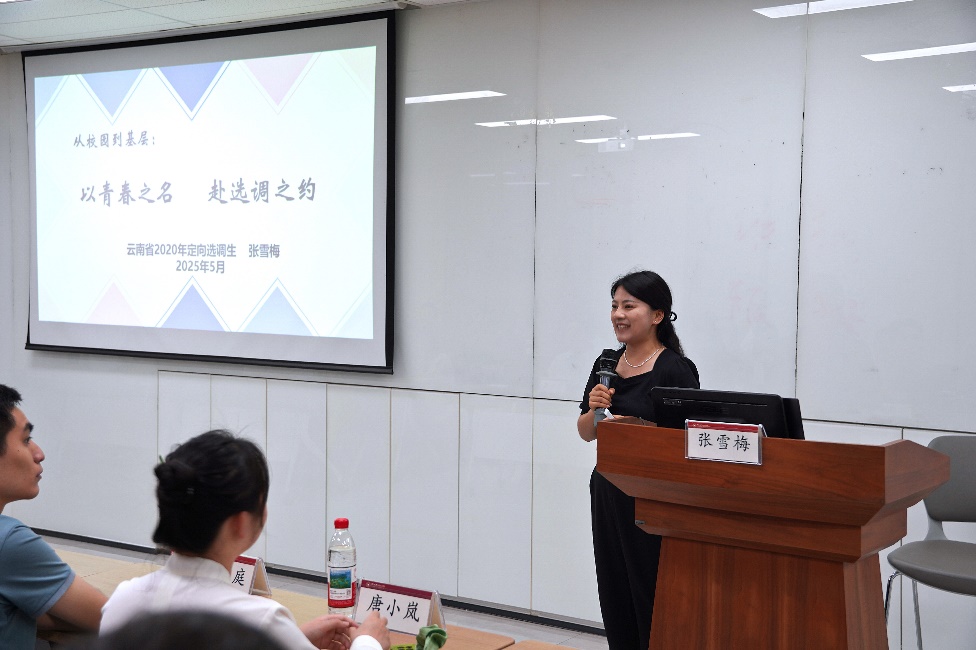 思想政治教育专业2020届硕士毕业生张雪梅学姐作了题为“从校园到基层:以青春之名赴选调之约”的分享,讲述自己作为基层选调生的工作体悟。她从“选择”讲起,强调要坚定目标、把握时机,结合理想与现实作出正确选择,她指出选调生具备培训体系完善、待遇保障有力、职业前景广阔等优势;其次,她分享了“基层”的意义,讲述了自己的驻村工作经历,强调基层工作对个人成长的重要意义在于能够深入了解民情、锤炼过硬本领;最后,她以“欢迎”作结,对在场师生发出热情邀请,欢迎大家到云南旅游、工作、学习。