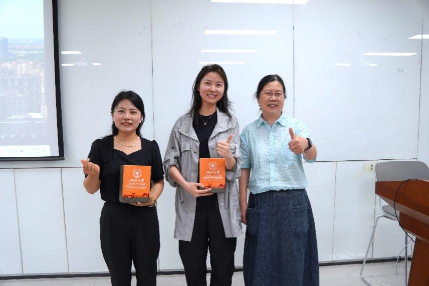 徐晓霞老师为两位优秀院友送出了学院精心准备的纪念品,并祝福她们前程似锦、工作顺利。