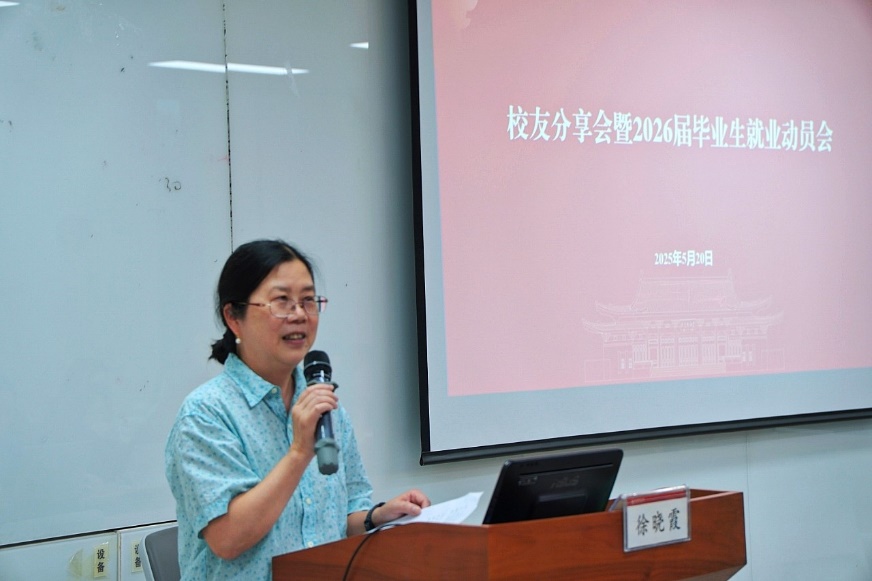 分享环节后,徐晓霞老师对四位校友表示感谢,并进一步结合学校就业工作要求作动员讲话。她指出尽管当前就业环境严峻,但就业渠道日益多元,鼓励同学们找准自身定位、明确求职方向、发挥专业优势,并重点介绍了深造、从教、从政的职业路径。随后,她介绍了学校、学院为支持就业工作提供的多种资源平台和系列活动,倡议同学们充分利用机会提升就业竞争力。最后,徐老师对同学们作出殷切嘱托,指出学院将持续推进毕业生就业服务工作,为每位同学落实就业去向保驾护航。