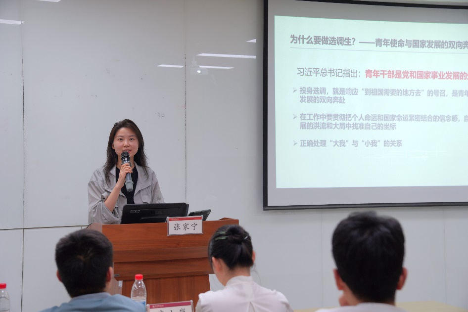 马克思主义基本原理专业2022届硕士毕业生张家宁学姐以“青衿之志,履践致远”为题,与大家分享了自己的选调备考以及工作经验。首先,她围绕“什么是选调生”简要介绍了选调生的概念内涵和职能定位等基本信息,并以河南省为例介绍了选调生工作的发展前景;随后,围绕“为什么要做选调生”这一话题,她结合自身两年的基层工作经历,分享了自己融入基层、深入群众的成长感悟,以具体的一个个事例,生动鲜活地带同学们真正走进基层工作,充分展现了选调生岗位的价值与情怀;最后,她围绕“如何进行选调备考”分享了自己的备考心得:在报考阶段要做好条件自查、政策研究与信息整合工作;备考基础阶段申论、面试准备中可以关注地方政府工作报告,培养政治意识、掌握规范表达、加深政策理解、把握发展方向;强化阶段需要针对性刷题攻克薄弱板块;冲刺阶段以全真模考提升应试能力。