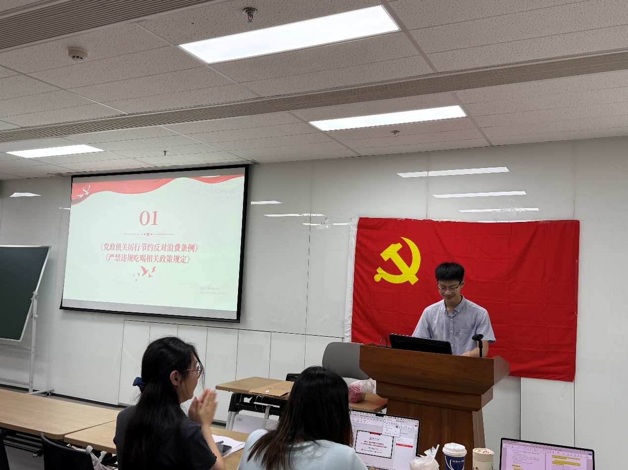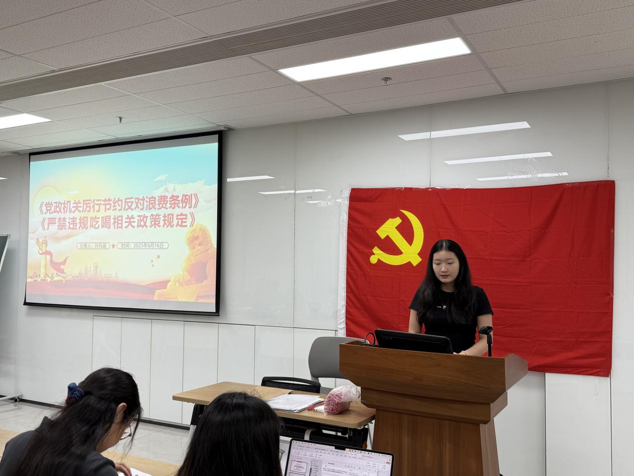 议程第一项,孙玙涵同志领学《党政机关厉行节约反对浪费条例》《严禁违规吃喝相关政策规定》。她介绍了《党政机关厉行节约反对浪费条例》的总则、经费管理、差旅标准等多方面内容,强调《条例》以习近平新时代中国特色社会主义思想为指导,对贯彻中央八项规定精神、深化纠治“四风”意义重大。此外,她还介绍了《严禁违规吃喝相关政策规定》,涉及公务接待、外宾接待等管理办法,引导党员同志深刻认识厉行节约、反对浪费的重要性,严守纪律规矩,在党日活动中传递了崇俭尚廉的正能量。